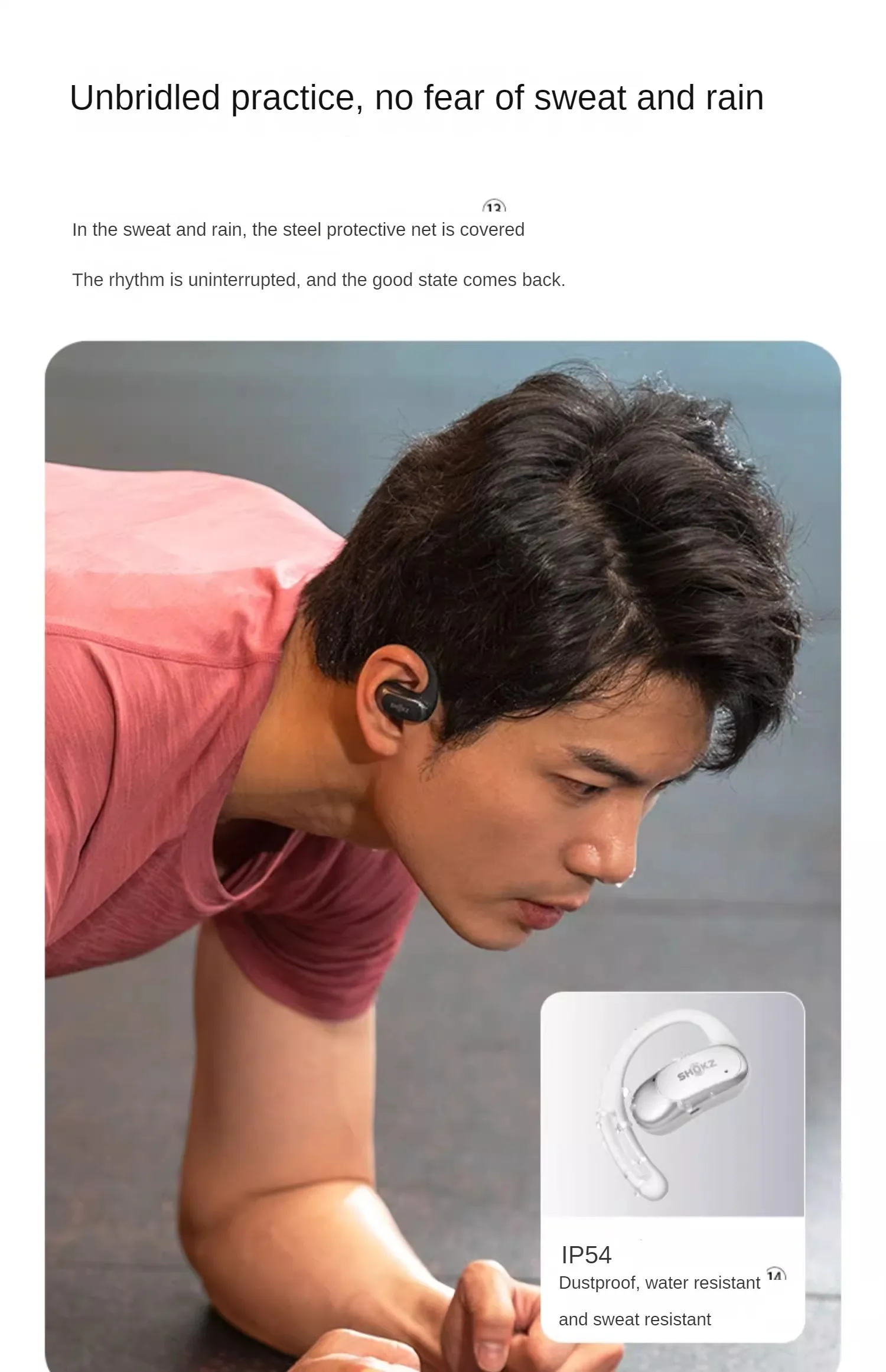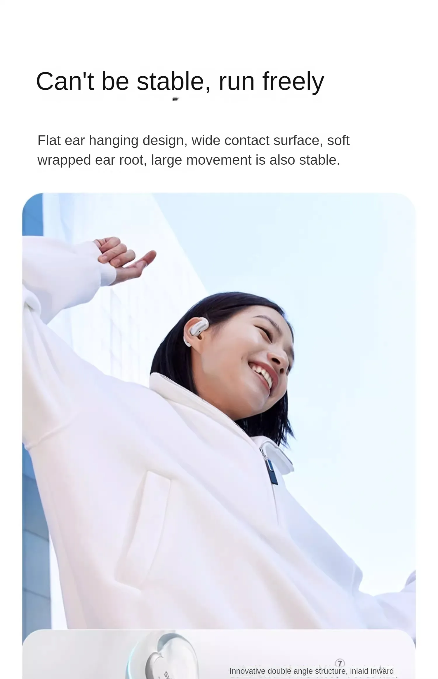 6. To ensure your personal safety, please use headphones correctly and control the volume appropriately to ensure safe cycling and exercise while listening to the surrounding environmental sounds clearly. 7. The double angled structure refers to the arc-shaped transition zone independently developed and designed by Shaoyin (Chinese utility model patent: CN202323052140.7), which makes the earphones better fit the ear cavity and improves stability and stability.